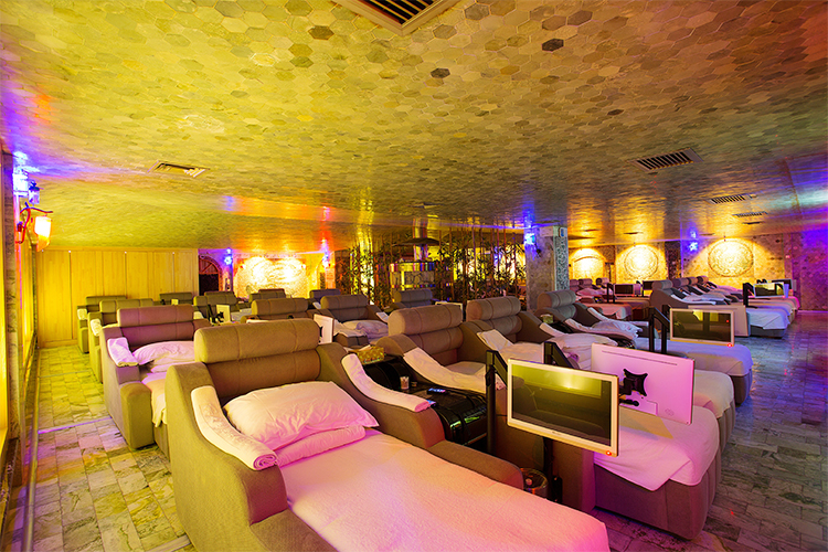明珠宝石浴四楼西侧的”玉石足疗能量房”,整体采用天然玉石打造,配有32张全自动升降沙发床,床上配有液晶电视,中央控制面板可操控床和电视。
