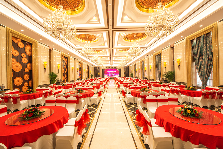龙凤厅采用进口大理石及水晶吊灯打造,豪华典雅,厅内配有线阵音响、舞台灯、高清LED大屏幕等设备,资深调音师全程服务,可承接400人婚宴、会议、满月宴等各种活动。